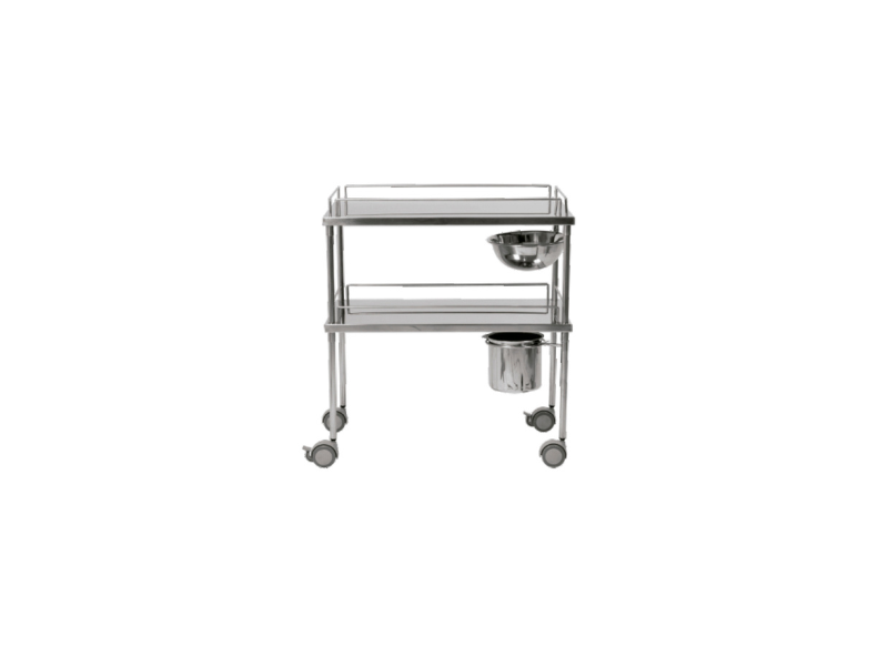 Estrutura tubular em tubos de 7/8” de diâmetro confeccionado em aço inox, tampo e prateleira confeccionada em fibra dotada de varandas laterais. Dotada de rodízios de 4” com freio nas diagonais.